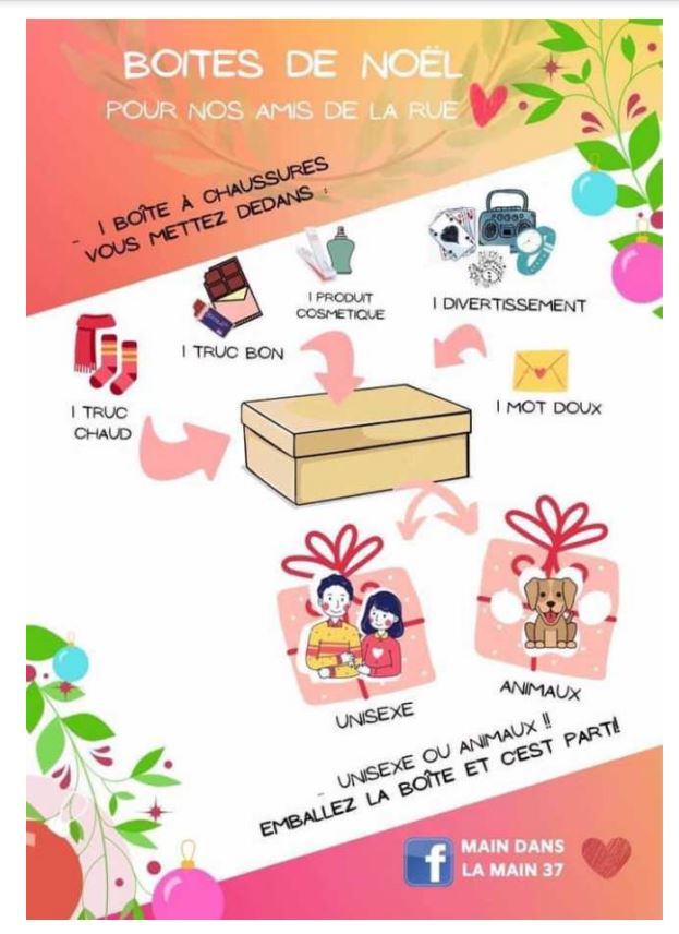 - l'autre pour des boites de Noël ou des éléments permettant de les constituer (voir affiche jointe) pour les personnes qui vivent dans la rue, à destination de l'association "Main dans la main 37".